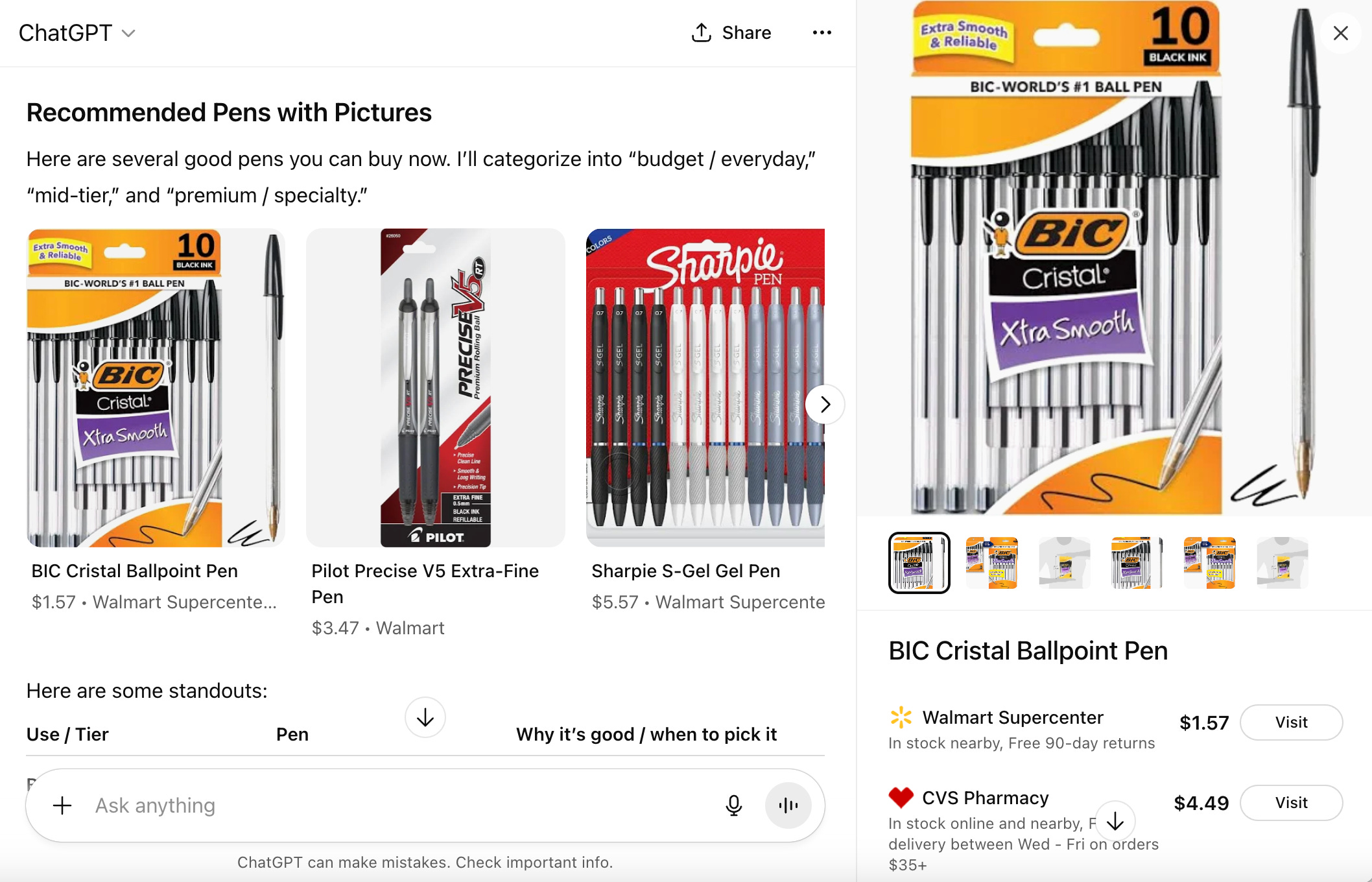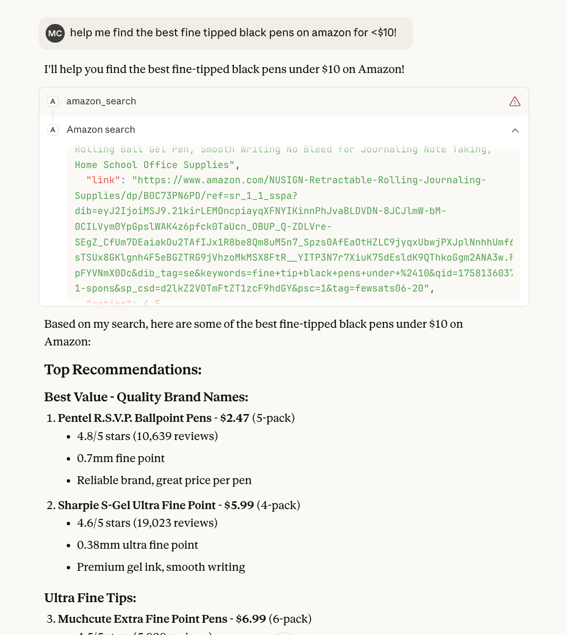 The results were solid, though I missed seeing product images (unlike Perplexity’s UI) and often clicked through to Amazon for more details anyway. I decided to buy some new pens as a low-cost test: