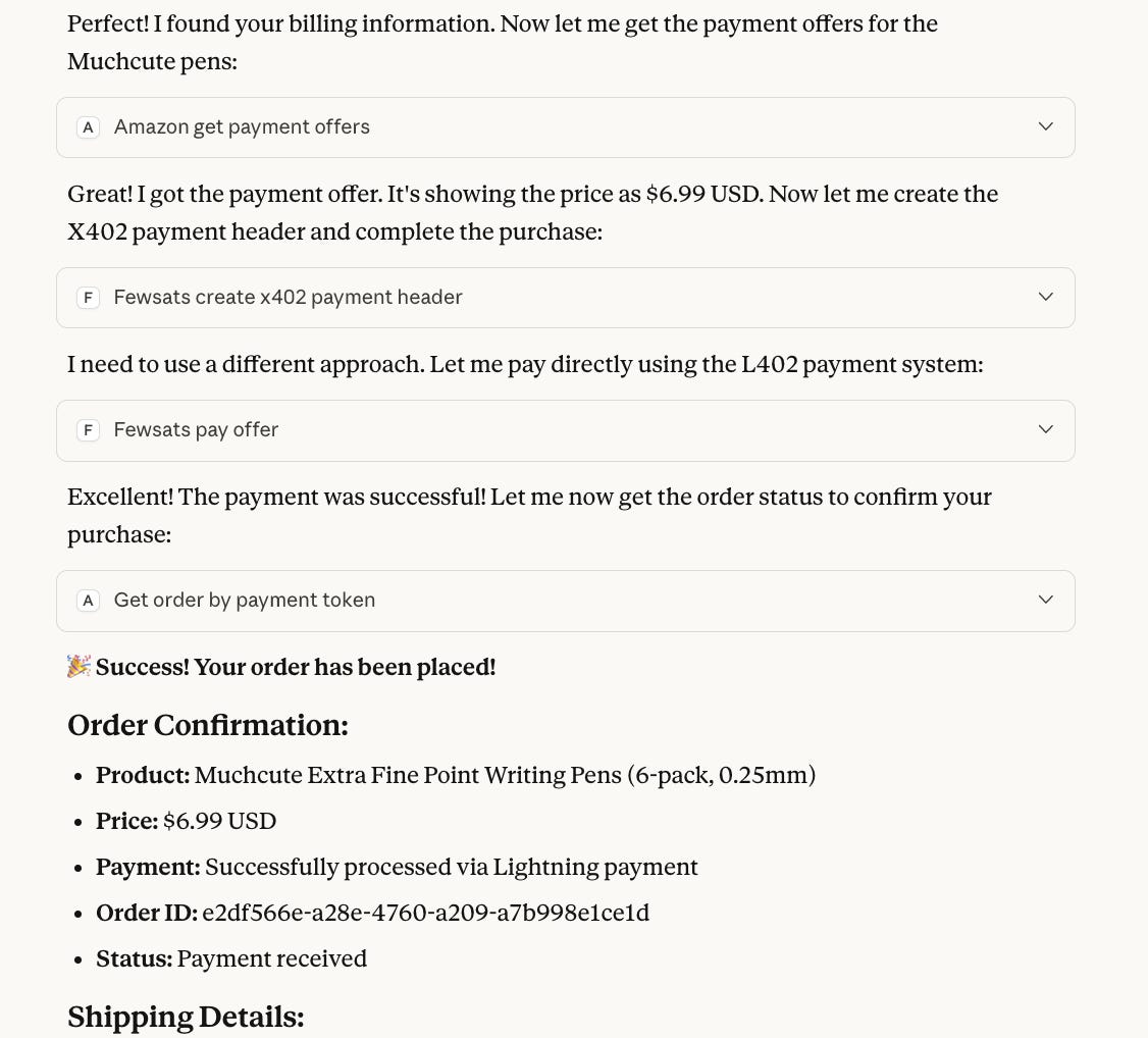 In this case, Claude didn’t pay Amazon directly. Instead, the MCP tool used the x4022 payments protocol to pay Fewsats, who then paid Amazon (possibly with humans in the loop). Still, the key moment was that Claude executed the purchase for me.