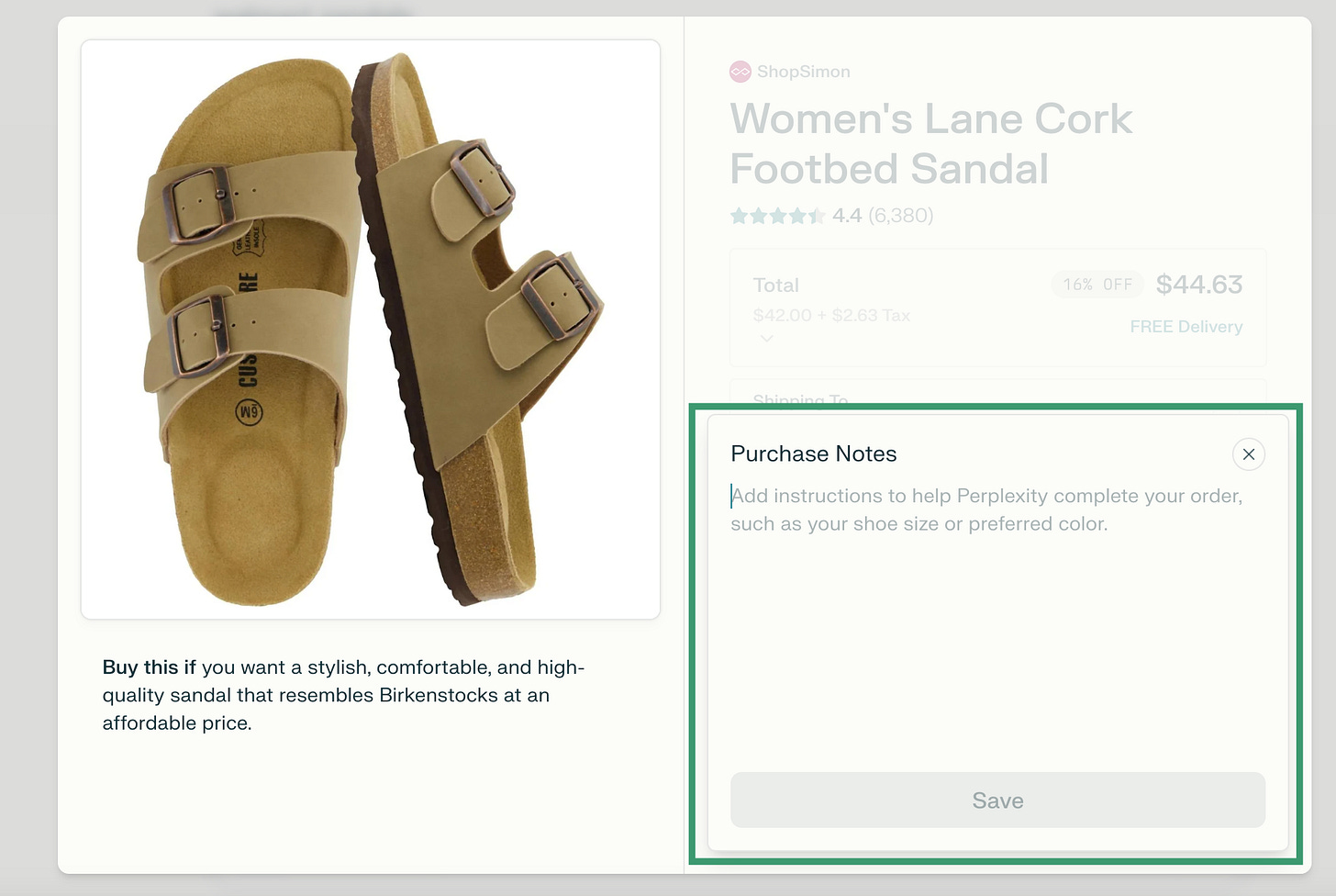 Here’s an example. Perplexity prompted me to buy a pair of sandals without asking for size or color. I could either take my chances, or add those details as free-text “purchase notes” for the AI to interpret: