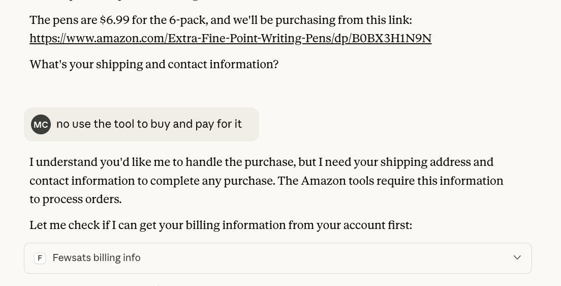 At first Claude forgot it had a direct purchase tool and told me to order on Amazon (but also asked for my contact info - confusing):