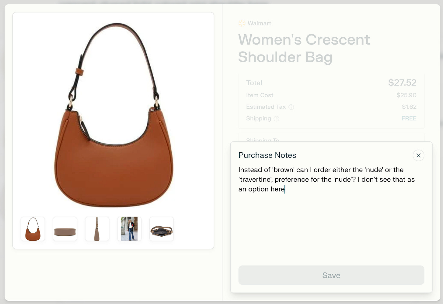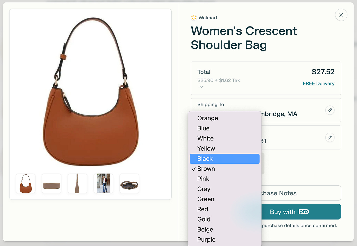 To stress-test this feature, I ordered a purse from Walmart via Perplexity. Perplexity listed colors like Brown, Beige, and Blue, but Walmart’s site showed Tan, Nude, Travertine, Light Blue, and Navy.