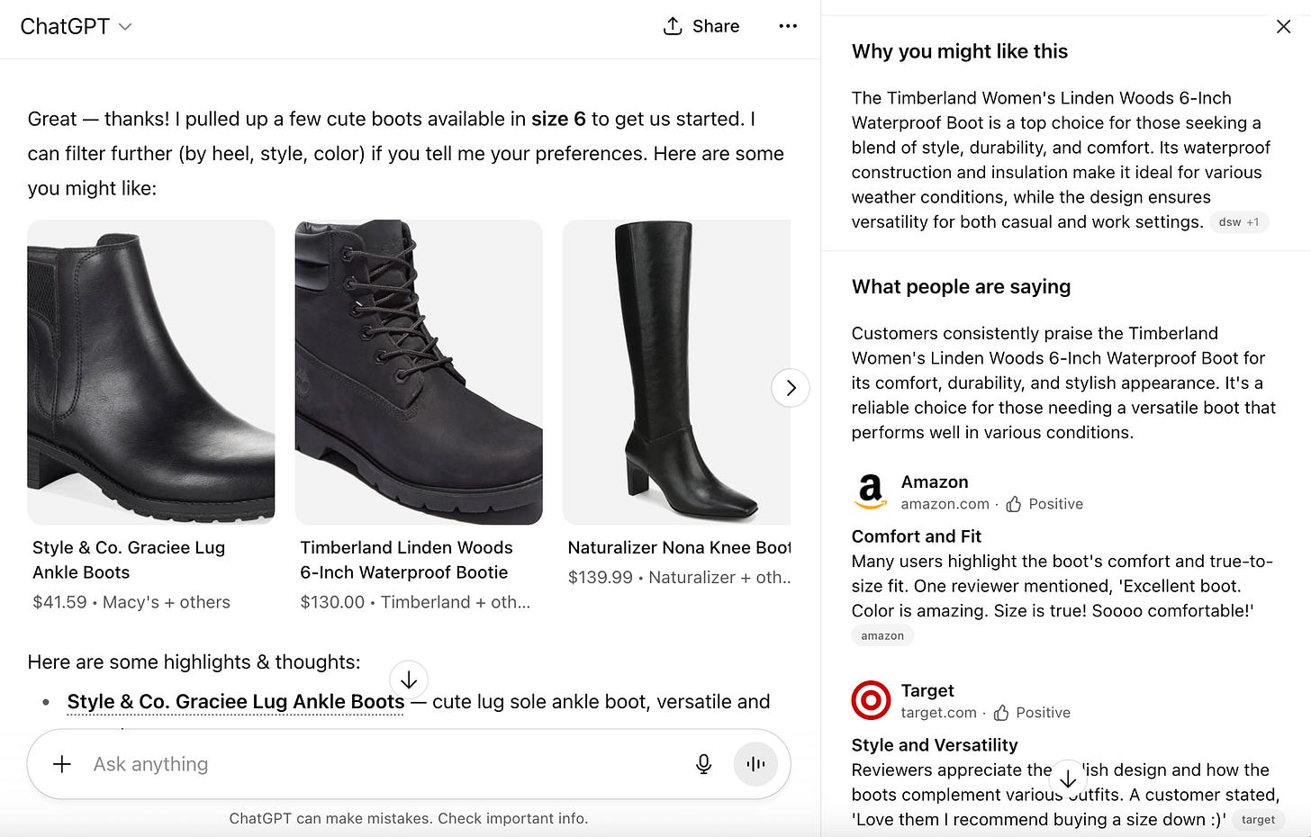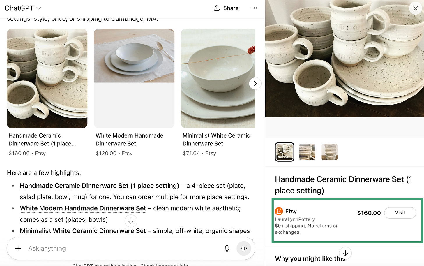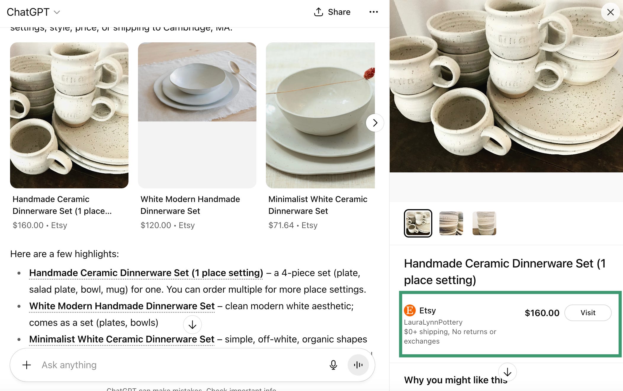 By launching onto the scene with (1) an impressively accurate product graph; (2) dynamic images and review summaries; and (3) deep partnerships with companies like Shopify and Etsy, ChatGPT is most of the way there.