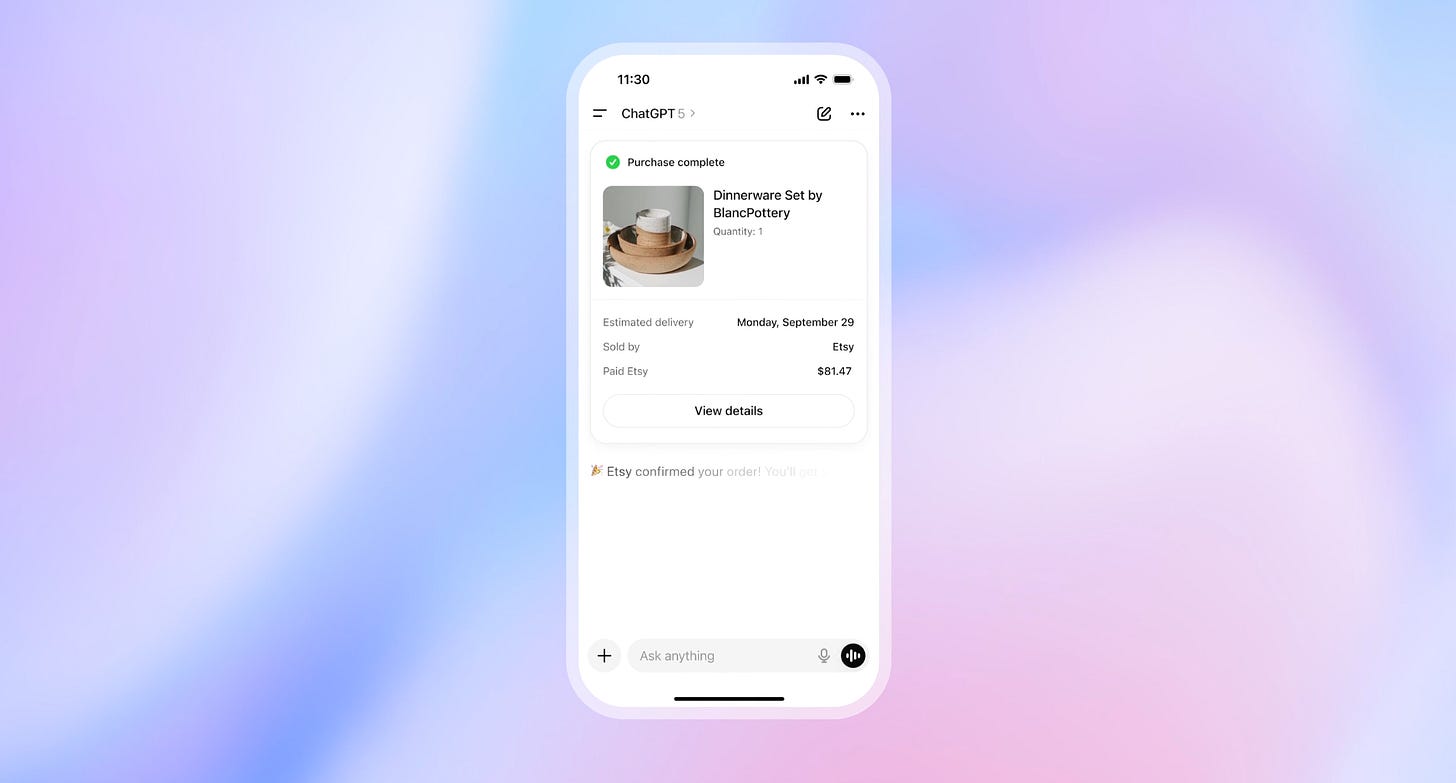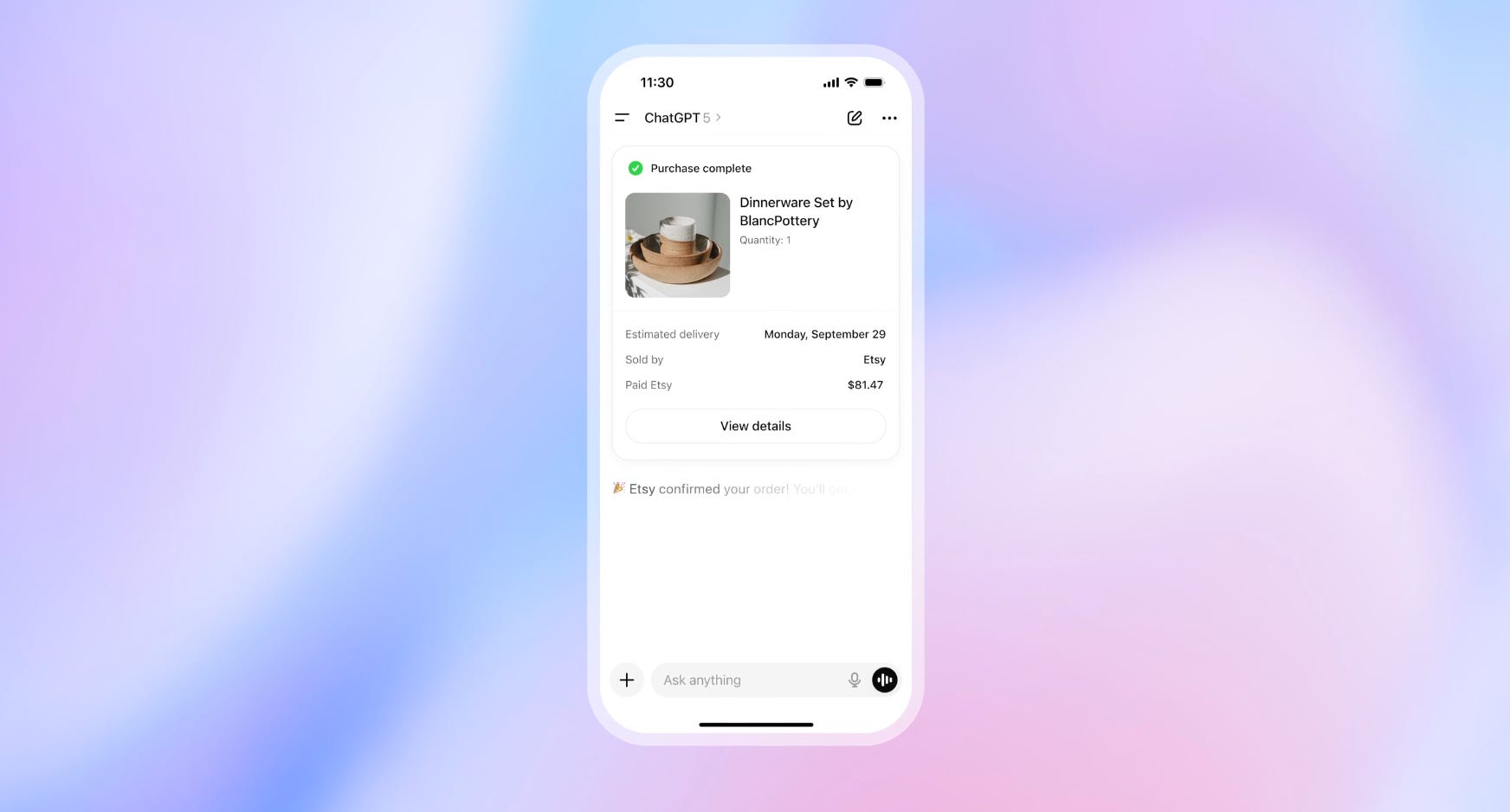 So anyway, now ChatGPT supports e-commerce! Buy it with ChatGPT launched today, in partnership with Shopify, Etsy, and Stripe: