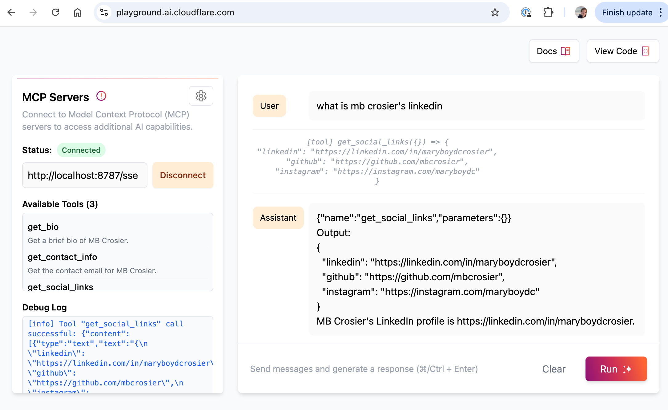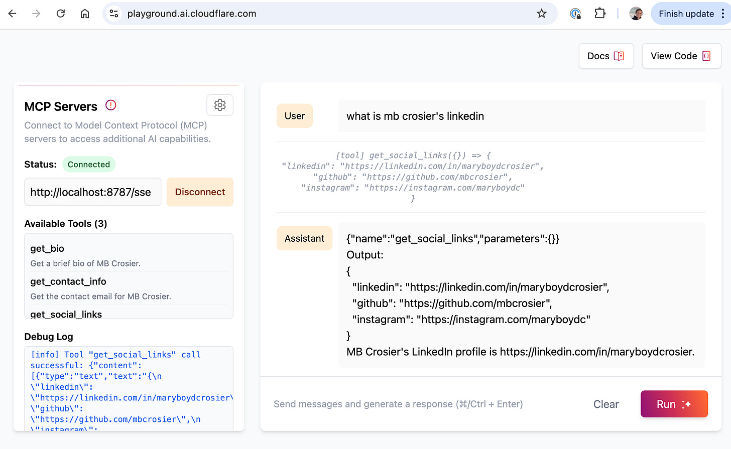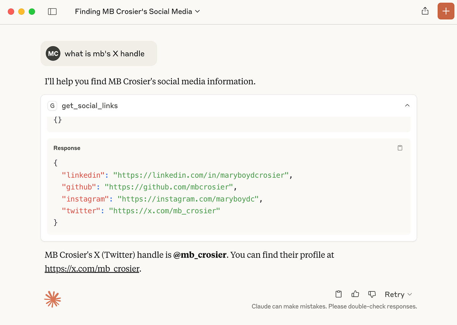 Notice what happened here: My MCP server has a function called get_social_links that returns complete URLs, including https://x.com/mb_crosier for my Twitter profile. But when asked for my "X handle," Claude didn't just dump the full URL. Instead, it: