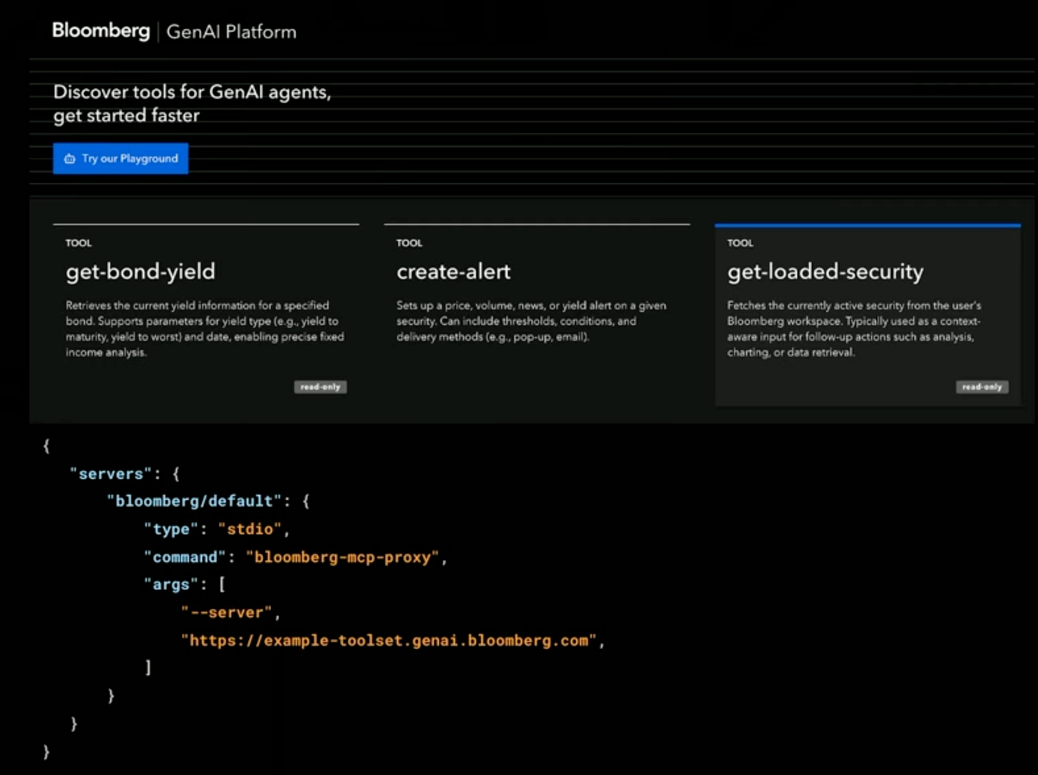 Bloomberg, meanwhile, is using MCP more on the product side. At the MCP Developer Summit, Sambhav Kothari described how Bloomberg is building MCP tools like get-bond-yield and create-alert into Bloomberg’s AI chat: