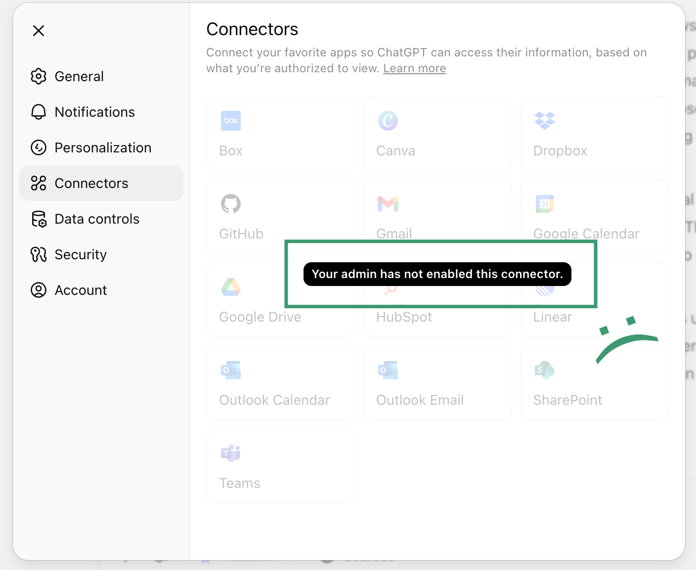 There’s only one problem: our plan’s administrators have disabled access to ‘Connectors’ (aka, MCP servers).