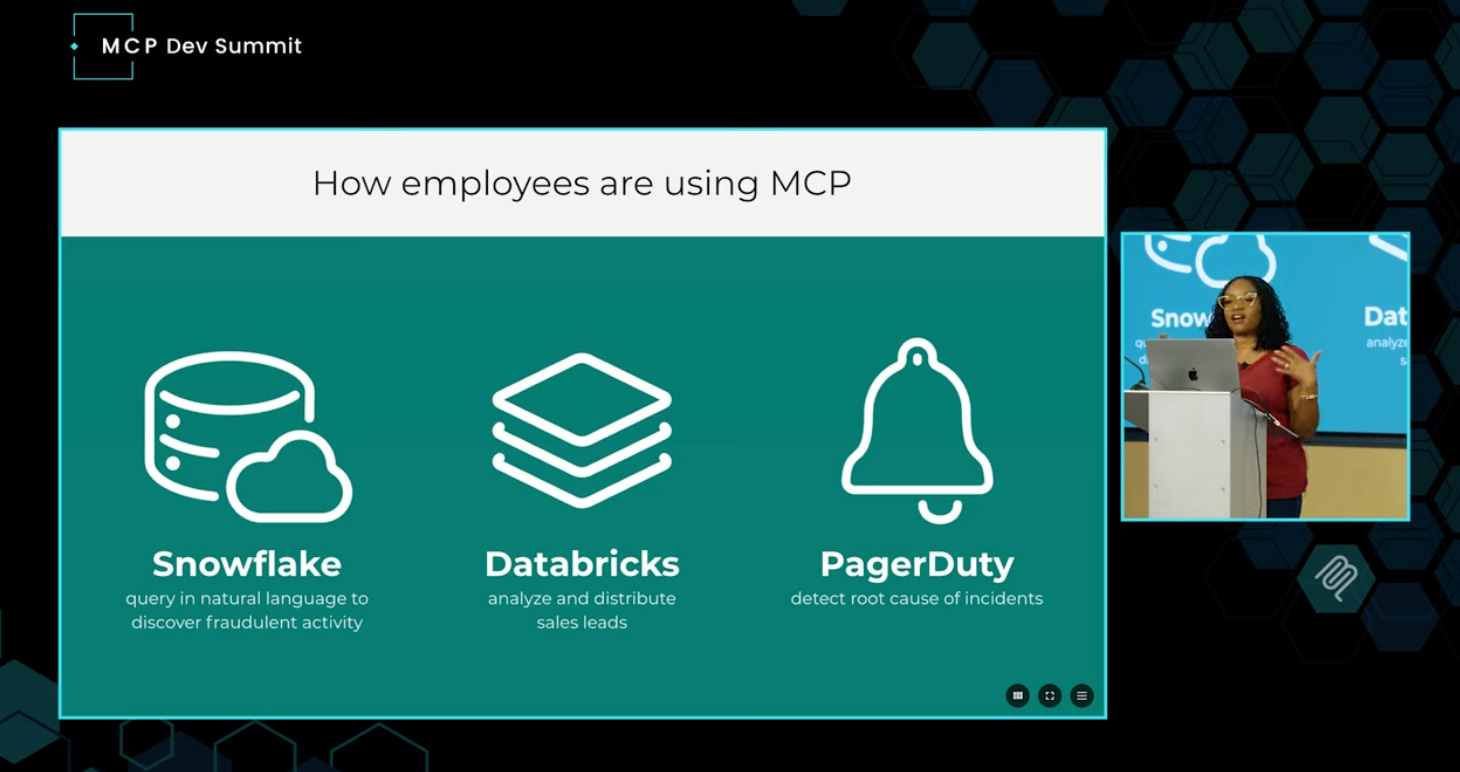 And as a result, Block has seen broad MCP server adoption and usage. Angie shared examples of how different groups use MCP servers to investigate fraud, explore sales data, and perform incident root-cause analysis: