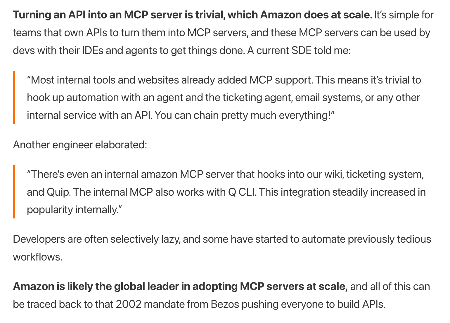 A few weeks ago, Gergely Orosz included this snippet about MCP adoption at Amazon in his newsletter, The Pragmatic Engineer (which I highly recommend!):