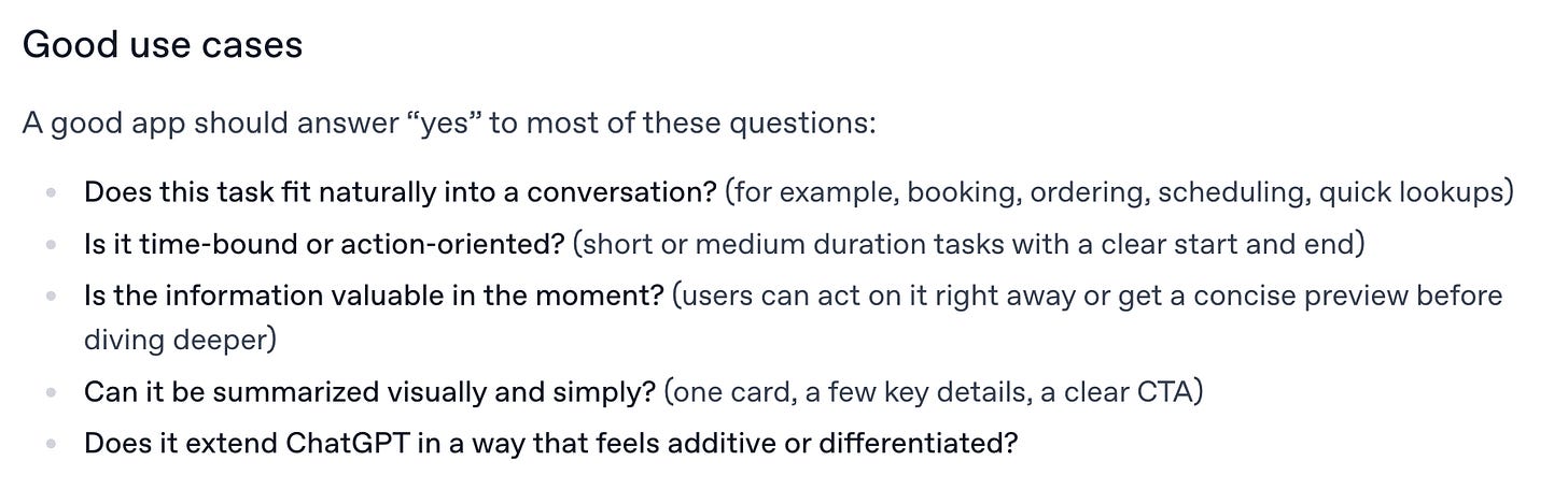 ChatGPT defines “good” app use cases as time-bound, action-oriented tasks that fit naturally into a conversation. This is a very narrow definition.